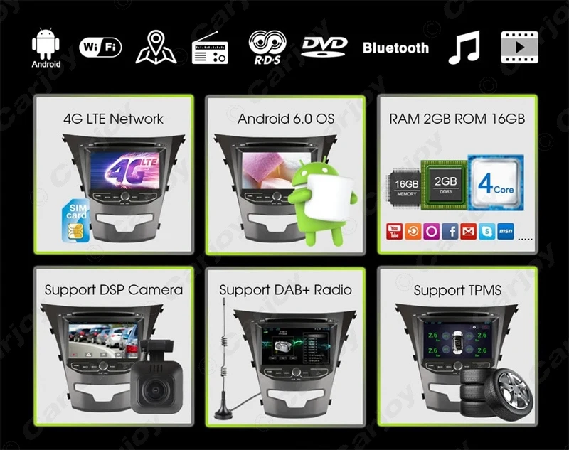 Supports Language: A Variety languages(Russian, English, Chinese, Spanish, Portuguese, Italian, French, Dutch,Turkish, and so on) GeneralInformation Compatibility ForSsangYongNewActyon/Korano(2014~Onward) CPU&Frequency MediatekMT3561QuadCore,1.5-1.8GHz RAM DDR32G NandFlashMemory Built-in16GB Menu(OSD)Languages Russian,English,Chinese,Spanish,Portuguese,Italian,French,Dutch,Turkish, Swedish,Norwegian,Polish,Japanese,Korean,Malayu,Indonesian(over60kinds) StandardFeatures 4GSIMCardSupport+GPSNavi+FM/AMRadio+Bluetooth+Multimedia+MirrorLink+USB/SD +AUX+SupportIPOD OptionalAccessories TPMS;3GDongle;DVR;RearCamera;DVB-T2/DVB-TMPEG4/ISDB-TDigitalTVBoxetc(haveextracost) Display Display 7inchDigitalTFTLCDMonitor16:9 Resolution 1024*600HD TouchScreen CapacitiveTouchScreen Internet WiFi Built-inWiFi,802.11b/g/n,compatibleWLAN 4G Built-in4GSIMCardSlot,Support4GLTENetwork GPS GPSANTChip MediatekMT6625 Sensitivity -160dBm Start Cool<26S,Hot1S Accuracy <5m MapStorage Built-inFlashorSDCard Maps SupportiGo,Navitel,Tomtom,Sygic,Googlemaponlineetc DVD(ifapplicable) TypeofDisc 12cmDisc CompatibleDisc DVD-Video,DVD-Audio,DVD±R/RW,DVD-ROM;CD-DA,CD-R,CD-RW;VideoCD,DVCD Pickup HOP-1200XH(HITACHI) DecodingIC AC8327 Multimedia 1080PVideoPlay Support USB&SD 3xUSBPort VideoFormat avi,mkv,mov,mp4,mpeg,mpg,rmvb,flv,H.264,H.265ect. AudioFormat MP3,WMA,AAC,RM,FLACetc. Photo JPG,BMP,JEPG,GIF,PNGect. Radio FM/AMFrequency FM1/FM2:65~74MHz/87.5MHz~108MHz;AM:522KHz~1620KHz Pre-setStations FM3*6;AM2*6 RDS Support RadioIC TEF6686(AutomobileFrontMountedChip) Bluetooth BluetoothVer. Bluetoothv4.0,SupportA2DP,BluetoothIC:MT6625 Phonebook Support Microphone Builtin(ExternalSupport) FileManagement MainFunctions Supportdownload,installanddeleteoverthousandsofandroidapps OfficialSoftwareEdit SupportreadandeditWord/Excel/Powerpoint/PDF/TXT DesktopApplications Weather,Clock,Wallpaper(livewallpaperorDIYwallpapersfromGalleryPictures) CommunicationTools Skype,Gmail,Twitter,Facebook,VKetc 3DGames Support HardwareSpecifications WorkingVoltage DC+10.8V~14.4V MaxPowerOutput 4x45W AMPIC ToshibaTB2929 RCAInput/Output Audiooutputx4,Subwooferx1,Auxinx1,Camerainputx2 Input/OutputType CVBS,SupportNTSC/PALformat RelatedOptionalParts CANBUS N/A DAB+ $49.90 TPMS $79.90 DVR(DSPCamera) $46.90 Microphone $12.90 3GDongle $29.90 ExternalDVB-T2HD $89.90 ExternalDVB-TMP4HD $82.90 ExternalISDB-T $54.90 VideoOutput(2-Way) $15.00 OBDELM327 $16.90